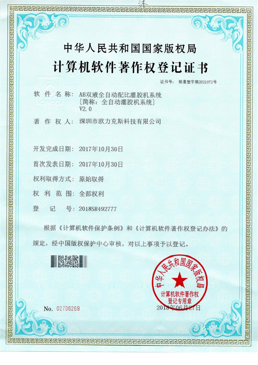 AB双液全自动配比黄色网站免费看片系统V2.0登记证书